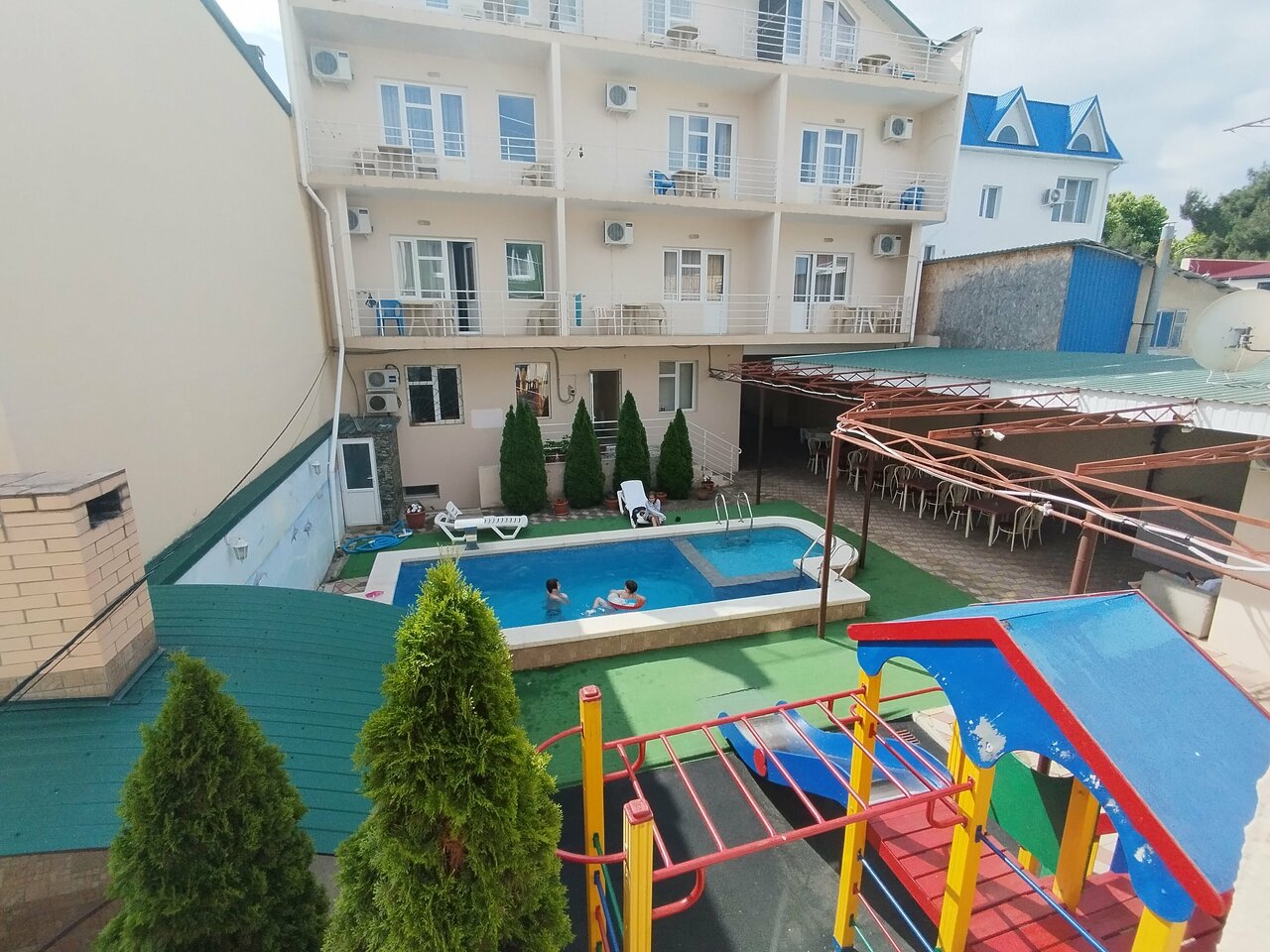 Гостевой дом состоит из двух корпусов. Номерной фонд подойдет как семьям с детьми, так и для компании друзей. На каждом этаже есть чайник, гладильная доска с утюгом. По просьбе предоставляется фен. На территории есть кухня для самостоятельного приготовления пищи. В просторном дворе имеется подогреваемый бассейн с подсветкой и гидромассажем. Также в бассейне есть детское отделение для безопасного купания вашего ребенка. Возле бассейна можно позагорать на шезлонгах.