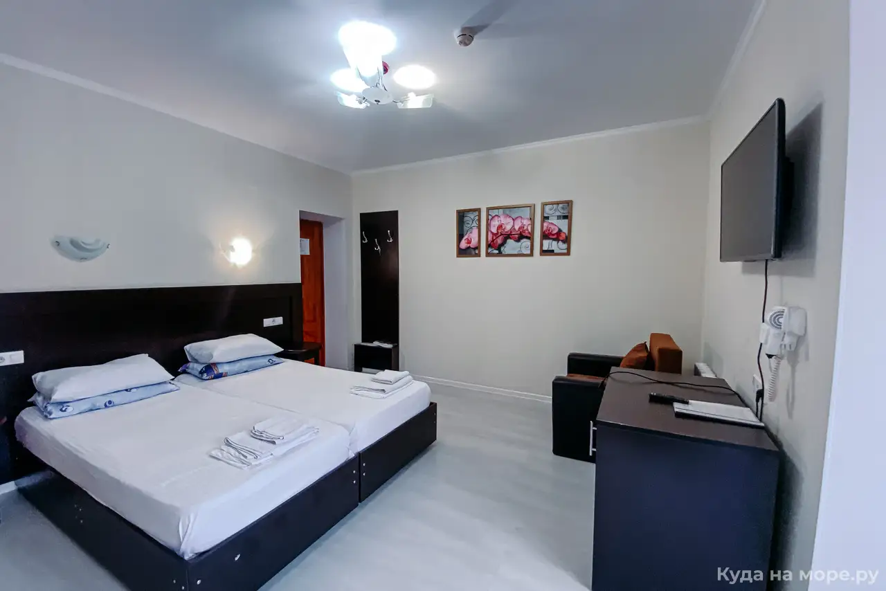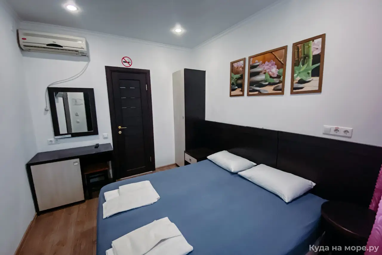 Каравелла представляет собой уютный гостевой дом, вместимостью 30 номеров. Интерьеры выполнены в современном стиле, в спокойных умиротворяющих тонах. Каждый номер оснащен всеми удобствами: телевизором, холодильником, ванной комнатой, кондиционером или сплит-системой.